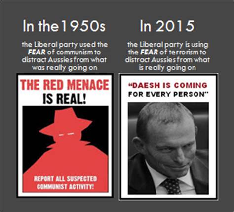 As in the 1950s, the perceived threat of terrorism has been used to take us to war, this time in Iraq – some 11,000 kms away, half way across the globe. And again, as in the 50s, the Liberal government is using its perceived brand as being stronger on defence than Labor to their political advantage, with political polls seeing the Libs get an immediate boost following one of Abbott’s many ‘terror’ talks. In a recent talk he gave on the 11th of June, he literally said “Daesh is coming, if it can, for every person“.
